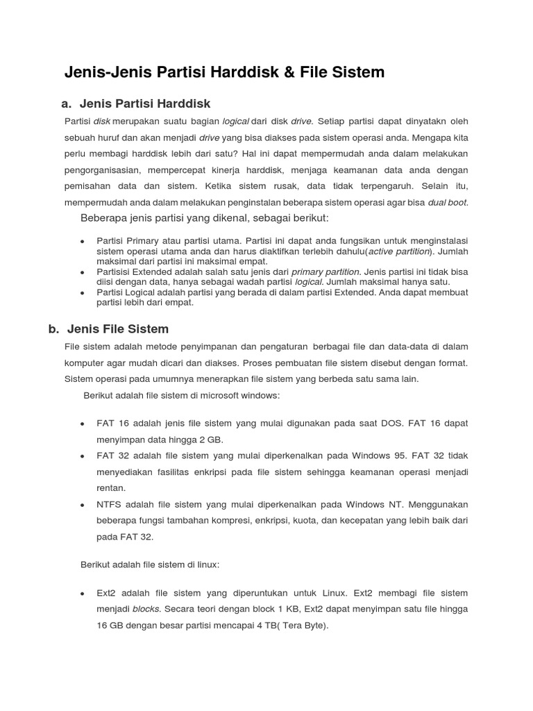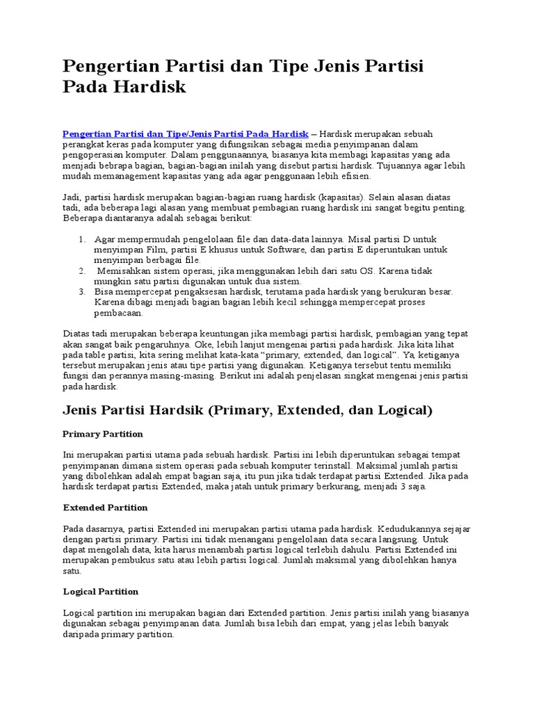 Dikarenakan umurnya yang juga sudah tua, fat32 menjadi salah satu format partisi yang didukung oleh banyak sekali jenis perangkat di luar sana. Karena jika pada hardisk terdapat extended, maka jatah untuk primary akan semakin berkurang. Partisi primary atau partisi utama. Beberapa jenis partisi yang di kenal adalah sebagai berikut: Partisi ini dapat anda fungsikan untuk menginstalasi sistem operasi utama anda dan harus diaktifkan terlebih dahulu ( active partition ). Mengapa kita perlu membagi harddisk lebih dari satu? Ada banyak partisi yang bisa dibuat tergantung sistem operasi yang digunakan, apakah sistem operasi linux atau sistem operasi windows. Partisi dalam bahasa inggris yaitu partition yang memiliki arti sekat, dinding pemisah atau pembagian. Partisi primary atau partisi utama. Partisisi extended adalah salah satu jenis dari primary partition. Partisi logical adalah partisi yang berada di dalam partisi extended. Partisi primary, ialah partisi utama pada harddisk yang memuat sejumlah file data. Hardisk merupakan sebuah perangkat keras pada komputer yang difungsikan sebagai media penyimpanan dalam pengoperasian komputer.